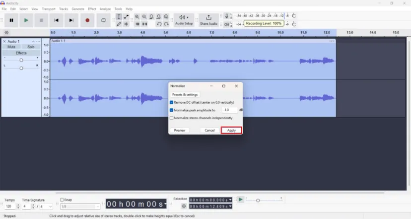 پیشنهاد میشود قبل از ذخیرهی فایل خام ضبطشده، ابتدا کل فایل ضبطشده را انتخاب و از منوی Effect > Volume and Compression گزینهی Normalize را انتخاب کنید.