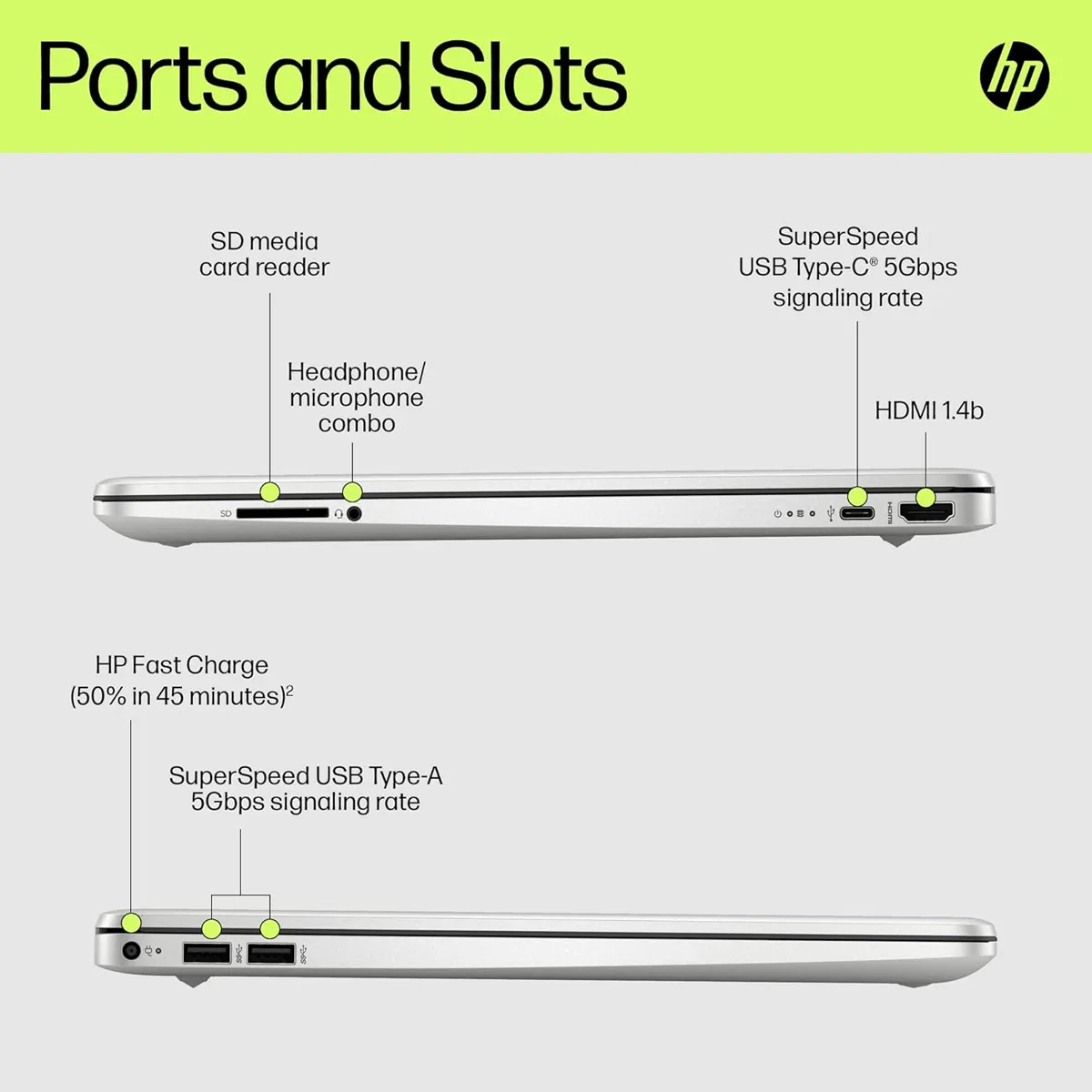 2xUSB 3.2, 1xUSB-Type C, HDMI 1.4b, SD Card Reader, headphone/microphone combo jack